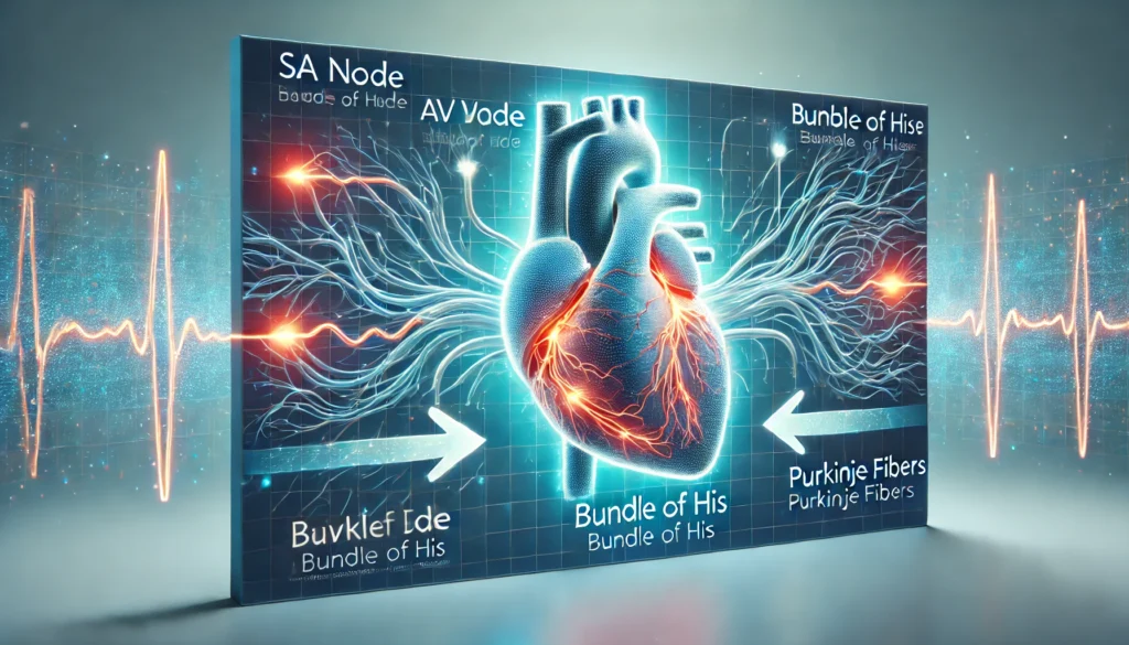 النظام الكهربائي للقلب يتكون من عدة أجزاء رئيسية تعمل بتناغم لتنظيم ضربات القلب. تبدأ هذه الأجزاء بالعقدة الجيبية الأذينية الموجودة في الأذين الأيمن، وهي المسؤولة عن توليد الإشارة الكهربائية الأولى التي تفتح المجال لبداية كل نبضة قلب. هذه الإشارة تنتقل بشكل منظم إلى العقدة الأذينية البطينية، والتي توجد عند تقاطع الأذينين والبطينين، لتسيطر على معدل انتقال الإشارة وتبطئها قليلاً لضمان امتلاء البطينين بالدم بشكل كامل.